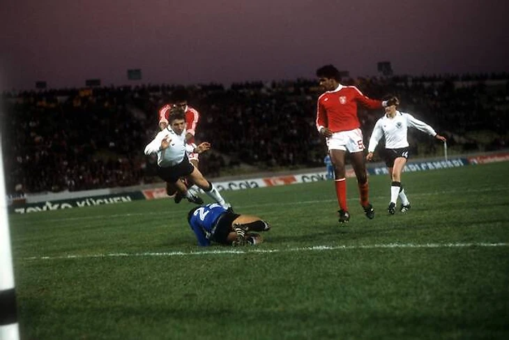 39-я минута. Бен Рехайем, получив пас от Гасми, движется по центру к воротам. Перед радиусом штрафной он разыгрывает стенку с Диабом, грудью подрабатывает мяч себе на ход и в единоборстве с Манфредом Кальтцем падает на газон в десяти метрах от ворот Майера. Судейский свисток перуанца Ороско молчит.