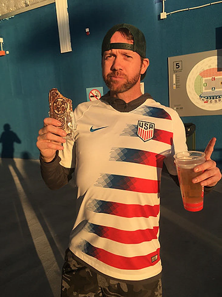 «Я из Сан-Диего, запланировал поездку в Россию еще полтора года назад, а моя сборная облажалась и не попала на турнир в последний момент. Ну и наплевать, не буду же я упускать возможность поехать в Россию. Тут очень круто и порой даже жарче, чем в Калифорнии, вау! Я везде хожу в футболке американской сборной, а люди подходят и утешают меня, хотя чего меня утешать – я-то в выигрыше, мне тут нечему расстраиваться, кругом только позитив. Так, а что это у тебя? Рашн джинджербред? (откусывает) На вкус как донат. Такой хрустящий донат (crispy doughnut). Классная штука».