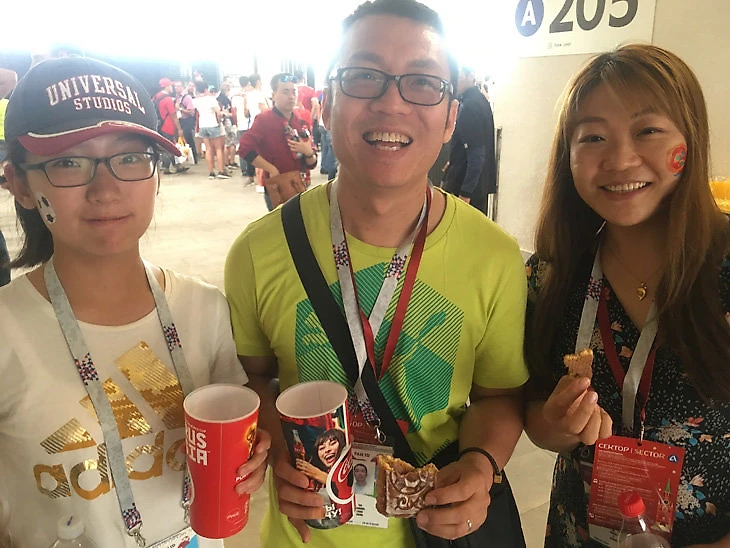 «Очень-очень вкусно, спасибо! (разламывают пряник на три неравных части, быстро съедают) Мы ни за кого не болеем, просто приехали посмотреть на красивый футбол. Мы хотим попробовать всю еду, которая тут продается. Пряник сами не пробовали, он уж очень необычно выглядит, но теперь будем. В Китае тоже очень любят пряники, ваш по вкусу примерно как наш mooncake, он же юэбин – со сладкой пастой из бобов».