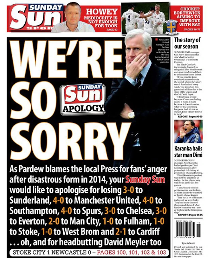 Другие клубные функционеры проявили себя в войне с местной прессой. Журналистам трех газет отказали в аккредитации из-за того, что они написали об акции болельщиков против владельца клуба Майка Эшли и не всегда называли стадион «Сент-Джеймс Парк» «Спортс Директ Ареной» (компания-спонсор, собственно, тоже принадлежит Эшли). На паре пресс-конференций оставшиеся журналисты в знак протеста не задали ни одного вопроса, а когда Пардью после очередного поражения ляпнул, что причина неудач в том числе в медиа, газета Sun – в кои-то веки – вышла с отличной обложкой: «Просим прощения за все поражения… да, и за удар Дэвида Мейлера тоже».