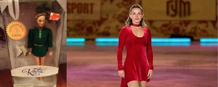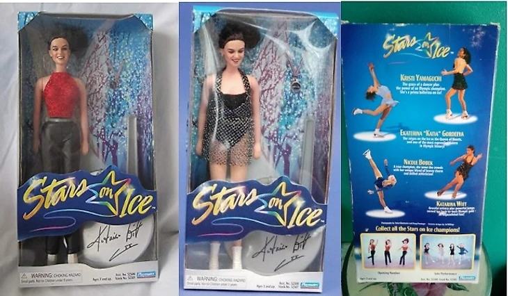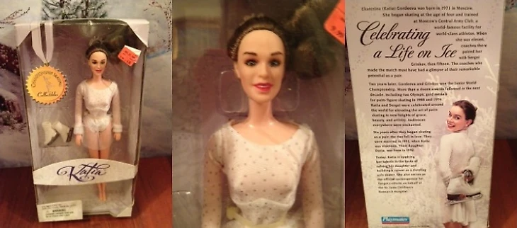 Но ещё до того, в 1998-м году вышла другая примечательная серия в духе «Барби» (но это не они), которая назвалась «Star on Ice». И вот там уже создатели действительно пытались придать лицам своих игрушек сходства с оригиналами. Насколько у них получилось - это уже другой вопрос. В серии были четыре фигуристки: Катарина Витт (было бы большим упущением если бы такой спортсменке не сделали кукольную копию), Кристи Ямагучи, Николь Бобек и Екатерина “Катя” Гордеева. Все они продавались в нескольких видах (в разных нарядах).