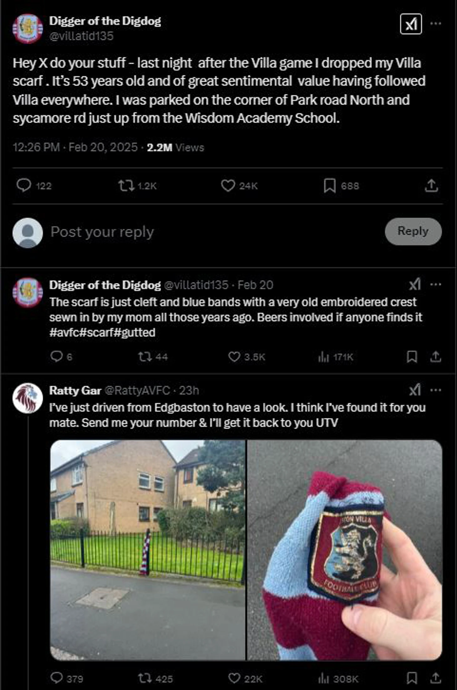 Вскоре после этого, другой пользователь, RattyAVFC, увидел сообщение и не просто прочитал, а начал действовал! Проехав от Эдгбастона, он внимательно осмотрел местность и, к удивлению многих, нашел потерянный шарф!
