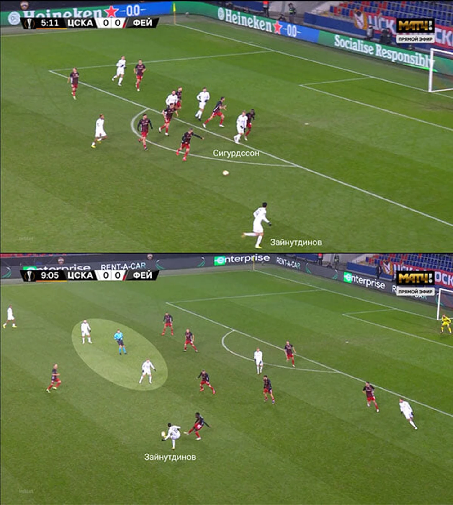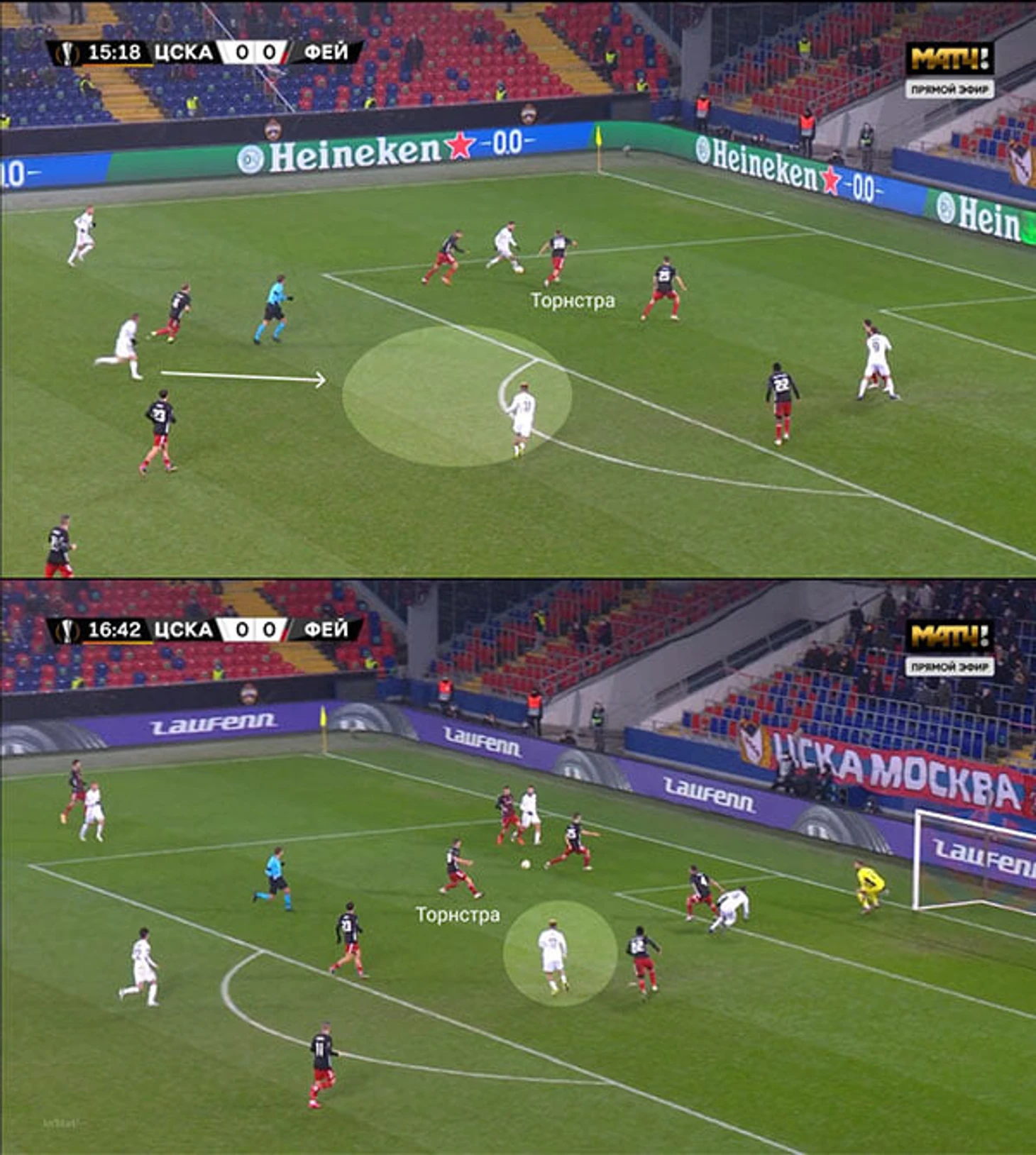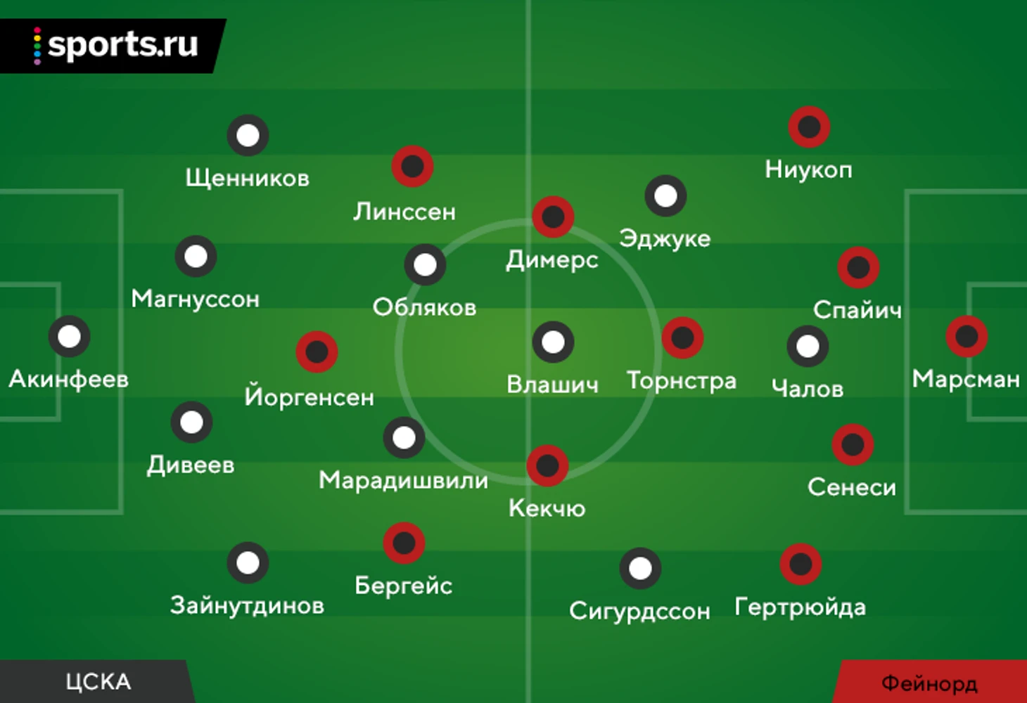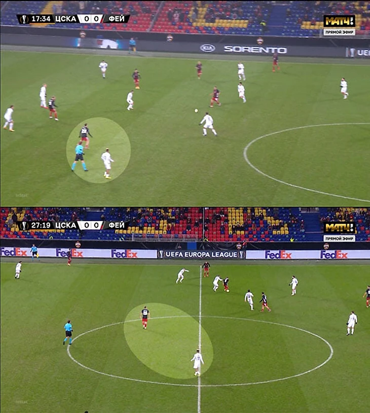 Изначально «Фейеноорд» терялся, когда ЦСКА перегружал центр. Продольный пас Бахе вынуждал «Фейеноорд» перестраиваться, а из-за большого скопления игроков ЦСКА слева смена позиций не всегда проходила корректно. Результат – Зайнутдинов один раз принял мяч в штрафной, нанес удар с 20 метров и разогнал пару атак переводами.