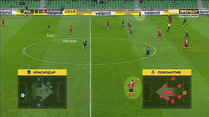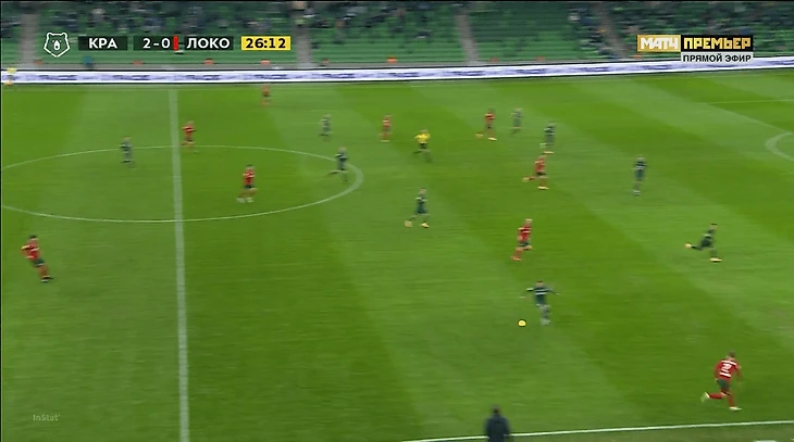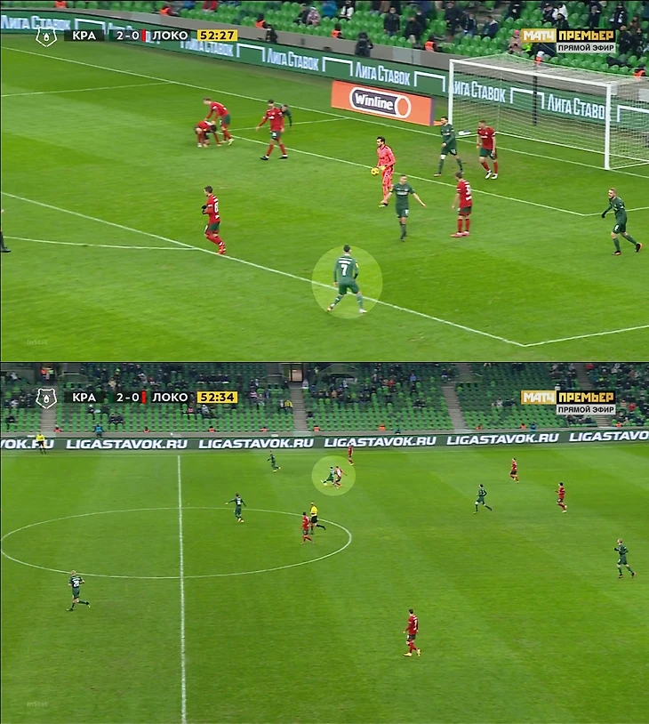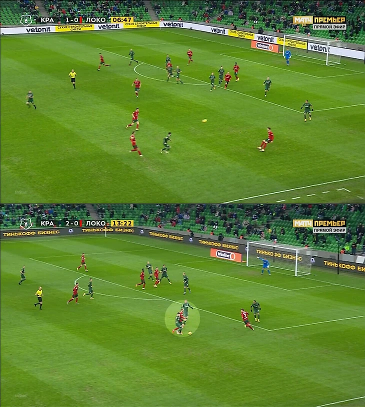 Команды выбрали похожие структуры – 4-2-3-1 с мячом и 4-4-2 без мяча. Так «Краснодар» и «Локо» давно играют в чемпионате и еврокубках – Кабелла и Миранчук часто поднимались в пару к форварду для прессинга. Однако отличие все же было: Кабелла уделял обороне гораздо больше внимания, чем Миранчук, и в некоторых эпизодах его движение делало разницу – сначала в защите, а затем в стремительной контратаке.