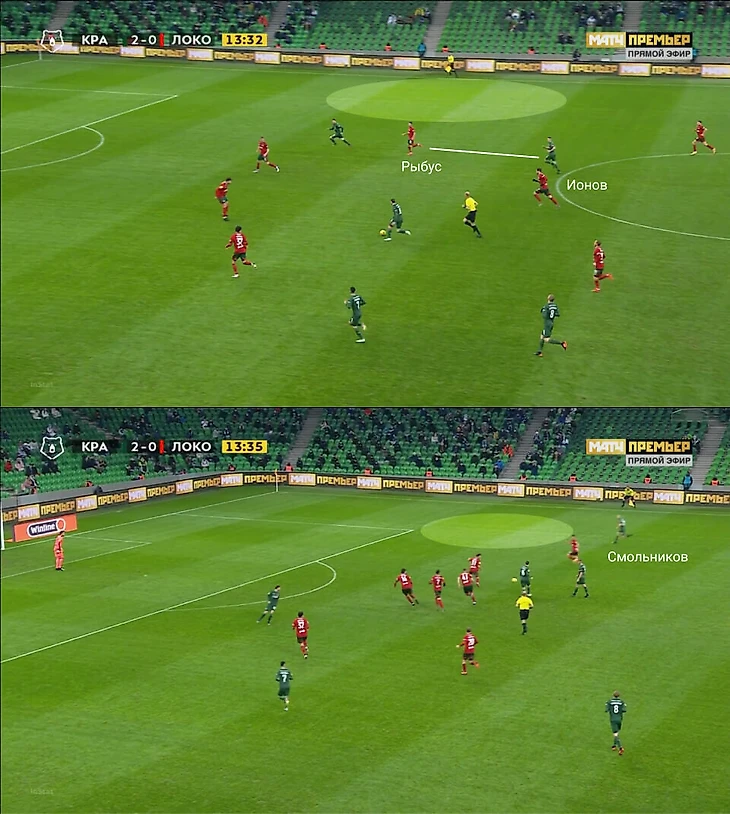 Провалы в этой зоне стали 12-м игроком «Краснодара». Другой постоянный атрибут атак краснодарцев – классное движение Ионова. Он не был обязан возить Рыбуса или заполнять опорную зону в стиле Классона – он часто смещался на одну линию к Бергу либо находился где-то неподалеку, вынуждая Рыбуса следовать за ним.