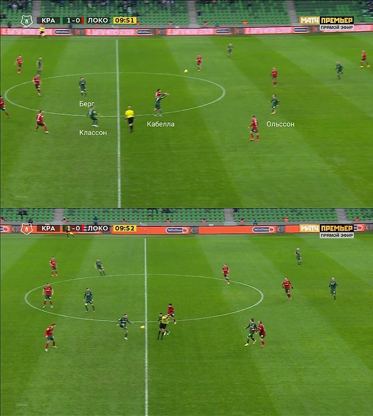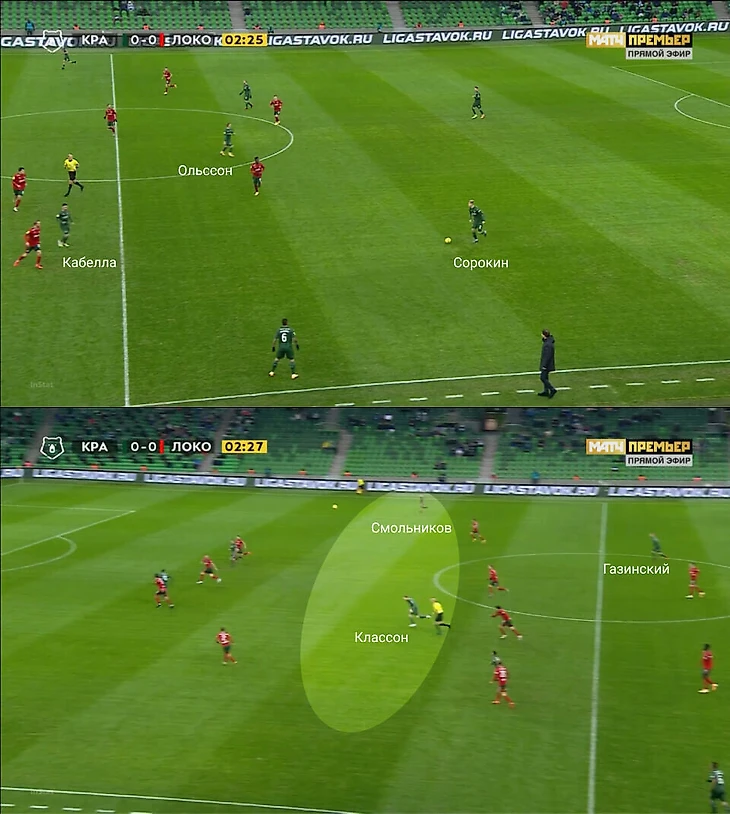 Сорокин без какого-либо давления сделал заброс, и тут же вскрылась основная проблема гостей – опорная зона пуста, а защитники не поддерживали движение команды. Обратите внимание: из полузащитников под контролем только Кабелла и на начальной стадии – Газинский. Ольссон при правильном движении доступен под передачу и тоже в состоянии разрезать защиту одним пасом.