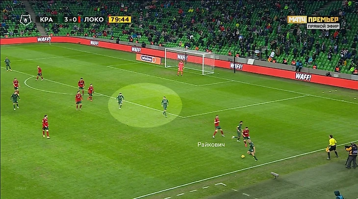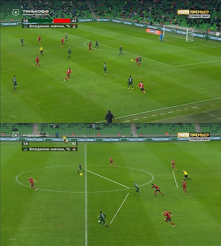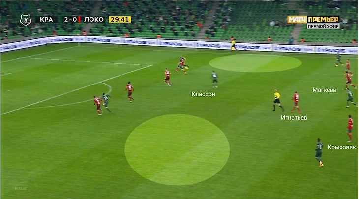 Два в одном: Игнатьев в одиночестве в опорной зоне, а Магкеев и Крыховяк не вернулись после прессинга. Итог – мяч подобрал Классон, который может выбрать любой вариант атаки.