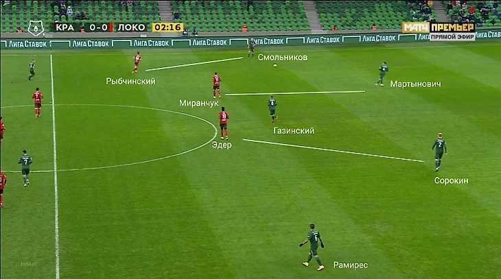 С первых минут показалось, что с опорной зоной «Локо» что-то неладное. Миранчук и Эдер изображали прессинг, а центральные защитники «Краснодара» располагались достаточно низко.