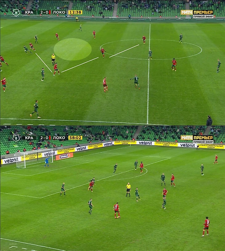 «Локо» стремился, чтобы вингеры заполняли полуфланги, открывая края для включений защитников, но постоянно на этом обжигался. Гостям не хватало игрока, прерывающего атаки.