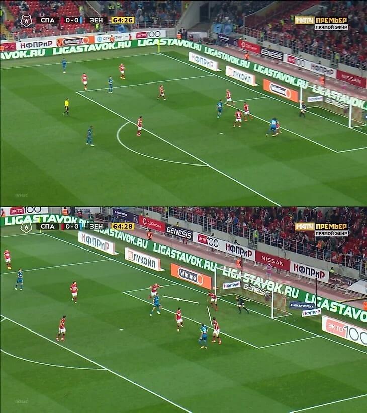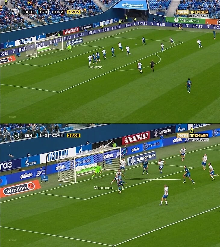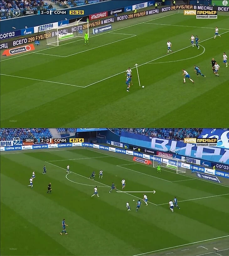 Тут стоит рассмотреть голы «Спартаку» и «Сочи». В первом случае Ерохин изначально оказывается в комфортных условиях – он располагается рядом с Айртоном, а не в зоне Жиго.