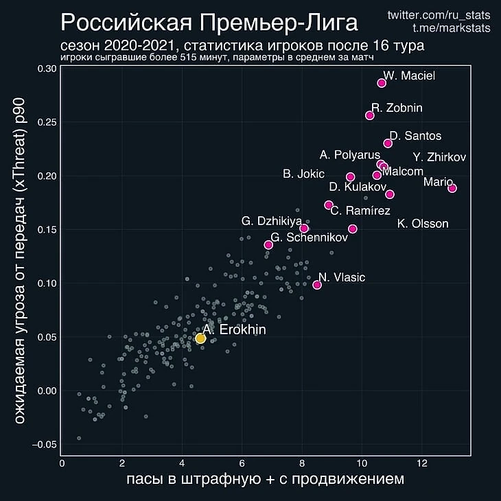 За счет выбора позиции Ерохин среди лидеров РПЛ по созданию голевых моментов.