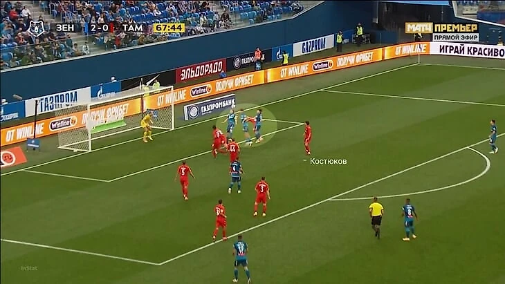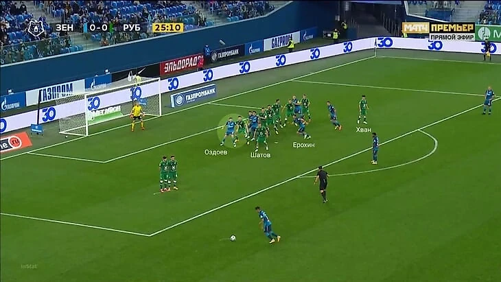 3. Примечательна работа Ерохина на стандартах. Он один из главных адресатов на штрафных и угловых: из 13 подач он принял 8. Больше только у Ловрена (15 приемов из 40) и у Дзюбы (10 из 15). Работа Ерохина привела к четырем голевым моментам и одному голу. В основном он пробивает после классической смены движения и грамотного выбора соперника (Терехов – 179 см, Йевтич – 182 см), поэтому гораздо интереснее рассмотреть ситуации, когда он врывается вторым темпом.