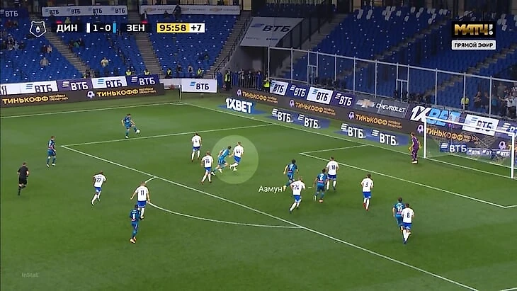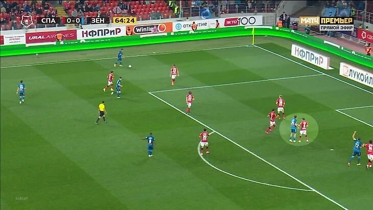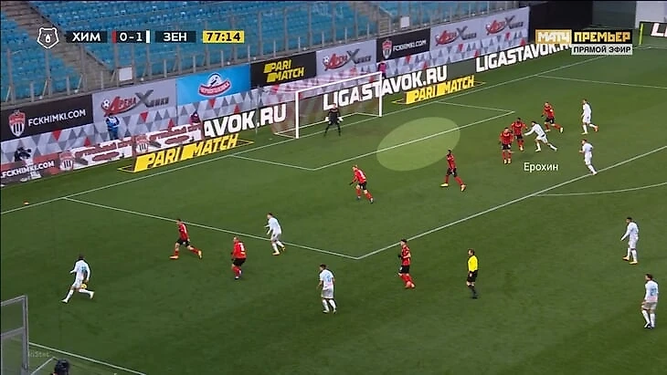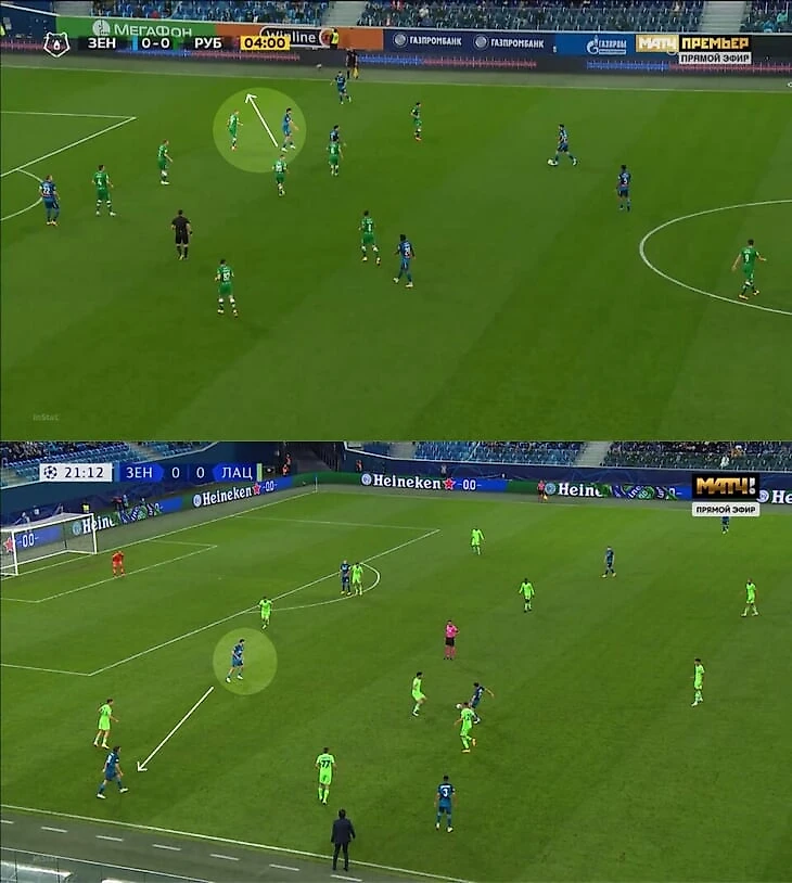 В похожем стиле его пытается использовать и Семак – Ерохин один из лидеров «Зенита» по приему мяча во флангах. Однако эта опция в целом неэффективна: против питерцев в РПЛ все играют глубоко, из-за этого у Александра мало возможностей для обострения (а в Лиге чемпионов с тактикой все печально).