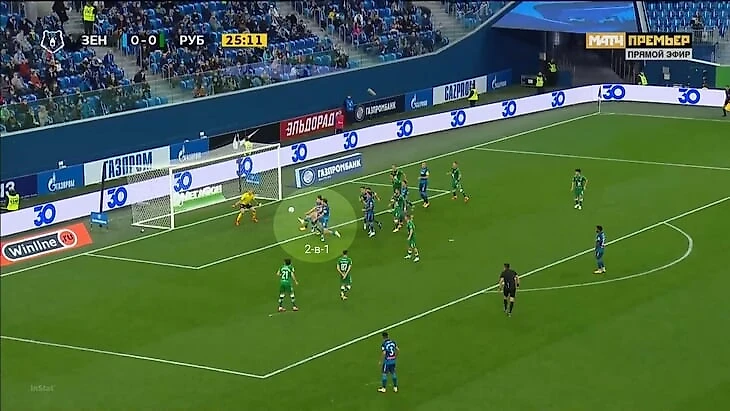 Пример – гол в ворота «Рубина». Гости расставились блоком 7-2, Хван контролирует потенциальную передачу направо, Шатов, судя по всему, ориентируется по мячу. Отметим расстановку «Зенита» – игроков явно меньше, но они создали ситуацию 3-в-2.
