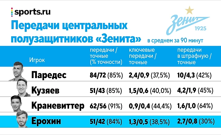 Ерохин создал 14 голевых моментов, из которых 7 закончились его точным пасом под удар – у него классное чувство мяча, он не делает длинные передачи, зато отрезает игроков коротким-средним пасом. Важная черта – новая роль не обнажает слабости Александра, поэтому серьезно снизилась пасовая активность (в этом сезоне он в среднем отдает 31,8 передачи за матч, тогда как при Манчини было почти 50).