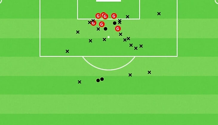 Здесь важно отметить: в прошлом сезоне у Ерохина была схожая статистика по ударам (35 в 30 матчах), но повысилось качество xG (0,12 xG/удар против 0,2/удар в новом сезоне). Тут важна работа тренера и самого Ерохина – он все так же мажет с расстояния 10 метров и более, но за счет ударов без давления во вратарской показатели выросли (4 гола из 7).
