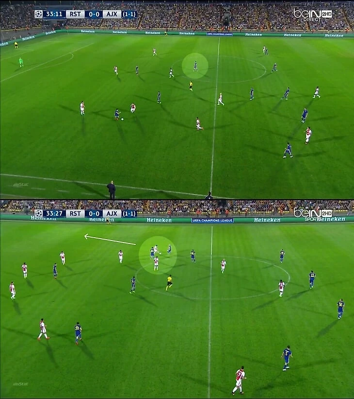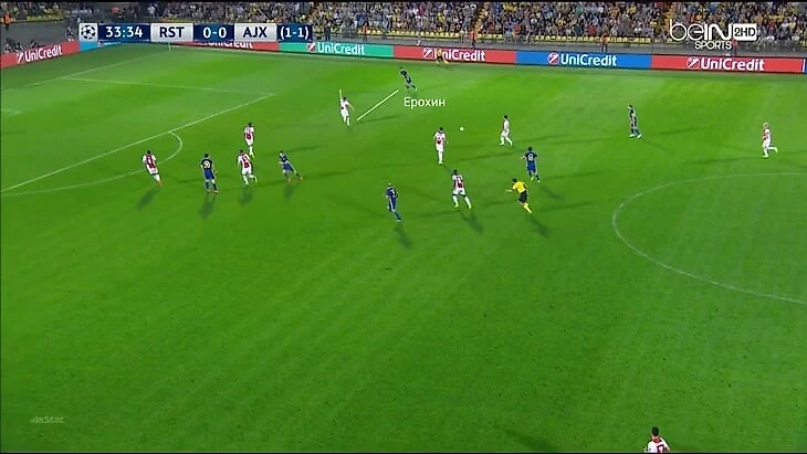 Первый гол в ворота «Аякса» – топ в плане поиска свободного пространства. Изначально Ерохин ищет вариант для включения в центре, но ростовчане теряют мяч, и он сразу бросается в прессинг.