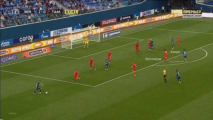 Он изначально двигался в метре от защитника, поставив его перед дилеммой: следуя за Ерохиным, он освобождает центр для Азмуна, а отпустив Ерохина, позволит ему замкнуть подачу на дальней штанге.
