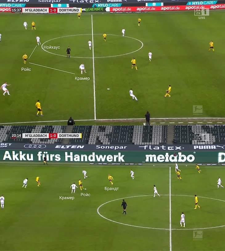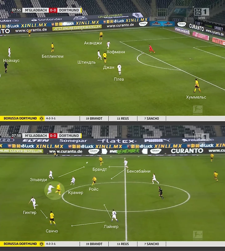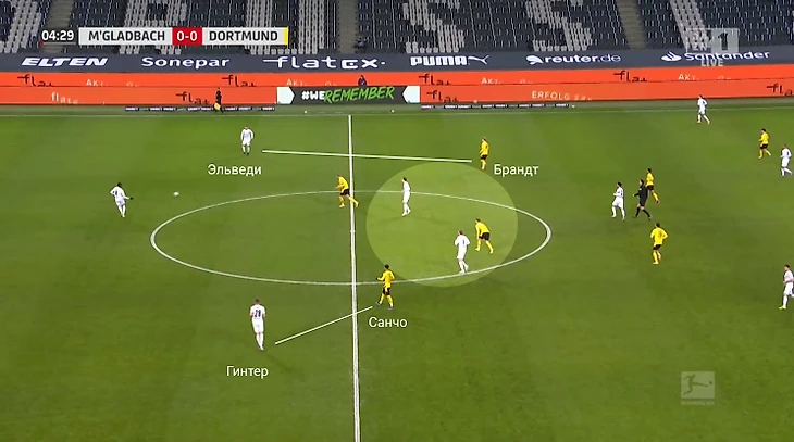 Еще добавился эффект неожиданности из-за схемы: Брандт и Санчо прессинговали несогласованно, поэтому Гинтер и Эльведи получали время. Еще перед Брандтом часто стояла дополнительная дилемма: вцепиться в Эльведи (но оставить Ройса одного) или быть с Ройсом (оставив зону на своем фланге).
