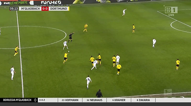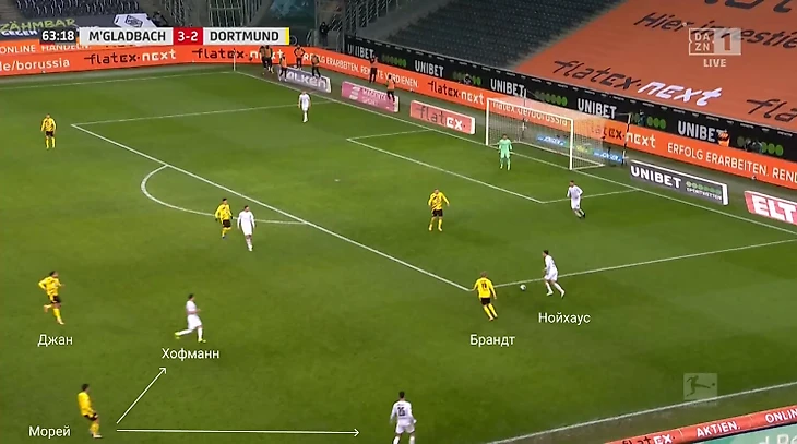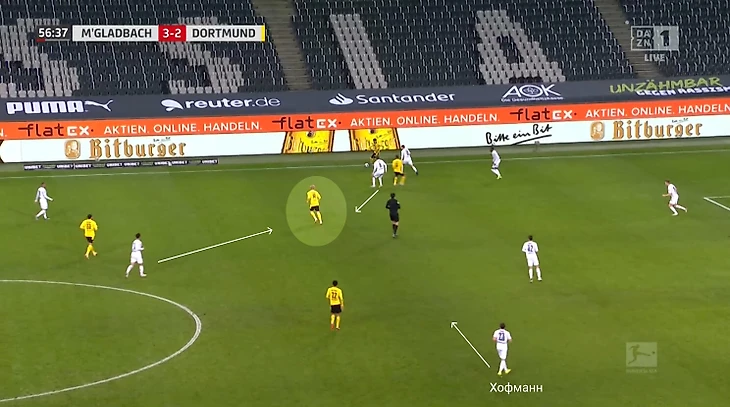 Все, что у него получалось – развернуться и перевести на другой фланг, где снова идеально работали механизмы «Гладбаха». На Морея выдвигался крайний защитник, а Хофманн его страховал (цепочка двигалась обратно). В итоге «Боруссия» бессмысленно грузила мяч в штрафную, а «Гладбах» контролировал подборы и второй темп.