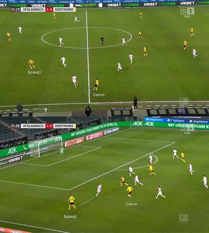 Еще они создавали микроперегрузы и умело их разыгрывали. Например, Санчо и Брандт часто играли в одной зоне. Это особенно заметно в первой предголевой и голевой атаках.