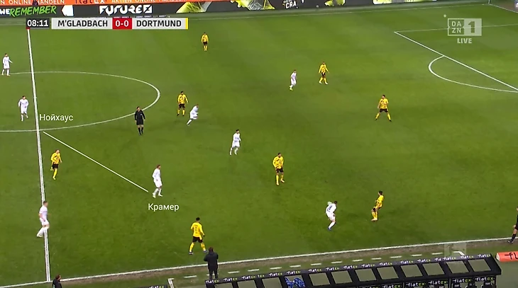 В последних матчах «Дортмунд», прессингуя, перестраивался на 4-4-2. Поэтому три центральных защитника – удобная опция под ситуацию 3-в-2. Но в начале матча Ройс часто оставался один в опорной зоне «Гладбаха» против Нойхауса и Крамера.