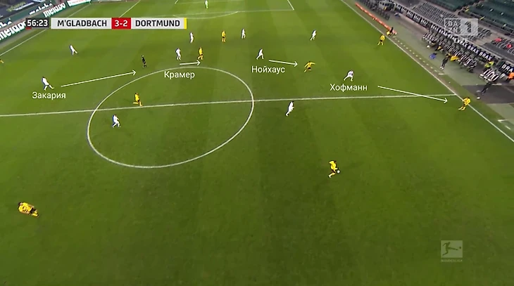 Еще они эффективно менялись при переводах с одного фланга на другой. Благодаря такому движению «Гладбах» имел численное превосходство на каждом участке поля, поэтому «Боруссия» просто выбивала мяч.