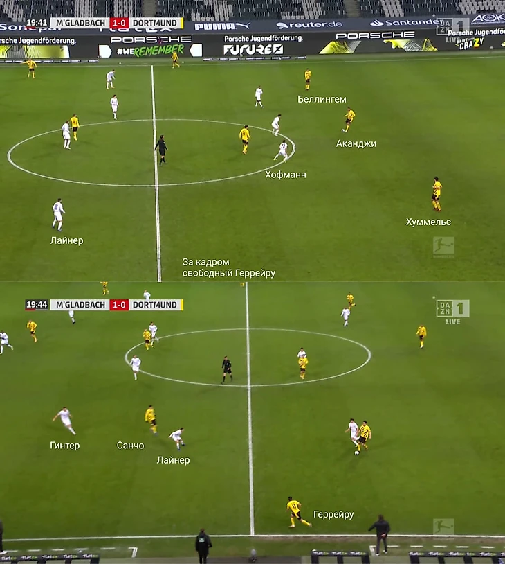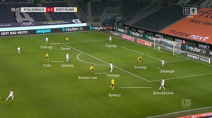 Это позволило «Дортмунду» завладеть инициативой. Затем «Боруссия» поняла, как взламывать «Гладбах». Беллингем и Джан создавали ситуативные тройки с Хуммельсом и Аканджи, стягивая на себя атакующее трио «Гладбаха».