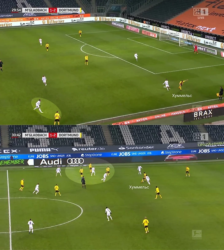 Хуммельс привык, что у него были варианты на краях, но из-за давления Закарии и и Хофманна он обрезался, после чего «Гладбах» заработал голевой штрафной.