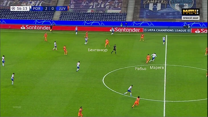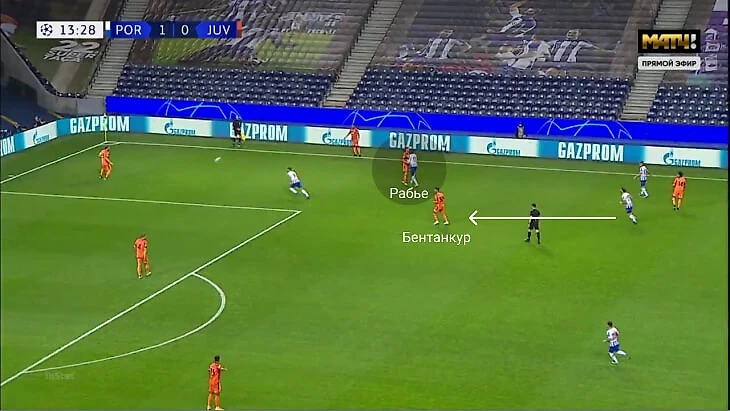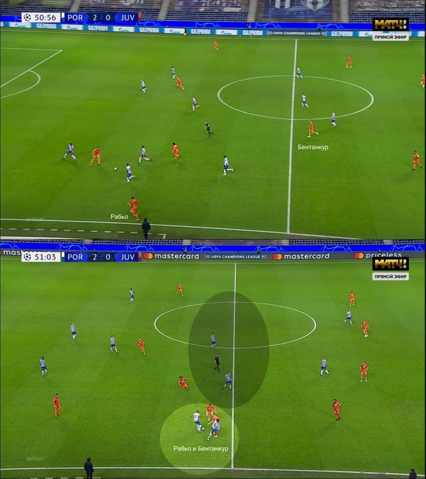 Но было и принципиальное различие с прессингом «Порту» – «Ювентус» почти не трогал вратаря. Это открыло новые возможности для контратак. У Марчесина было время на оценку ситуации: Рабьо и Бентанкур примагничивались к Урибе и Оливейре, оставляя за спинами много места. Нападающие «Порту» стягивались в это пространство, поэтому защитники «Юве» выбирали: выдернуться за ними (добавив пространства для рывка) или дождаться приема мяча.