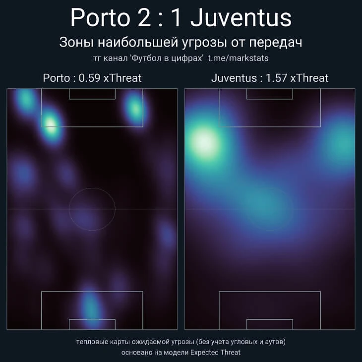 По продвинутой статистике «Ювентус» тоже превзошел «Порту». Обратимся к модели Expected Threat – эта система рассматривают вероятность, насколько то или иное действие приближает текущее владение мяча (пас, дриблинг, отбор мяча) к голу. Чем выше показатель – тем лучше.