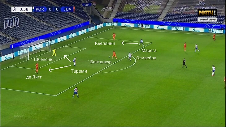 Но «Порту» давил точечно и все равно доставил сопернику много проблем. Главный ориентир – розыгрыши от ворот + ауты. Основные противостояния: Тареми и Марега играли по Кьеллини (после замены – Демиралу) с де Лигтом, вингеры ориентировались на крайних защитников, Оливейра или Урибе опекали Бентанкура.