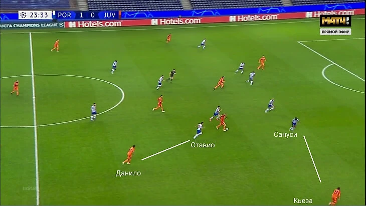Игнор правого фланга объясняется положением Данило и Сандро. «Ювентус» агрессивнее атаковал слева, поэтому «Порту» уделял больше внимания именно этой зоне. Справа ситуация проще: Данило не так часто смещался на фланг, поэтому Отавио порой застывал в полупозиции – тогда как Кьеза оставался 1-в-1 с Сануси.
