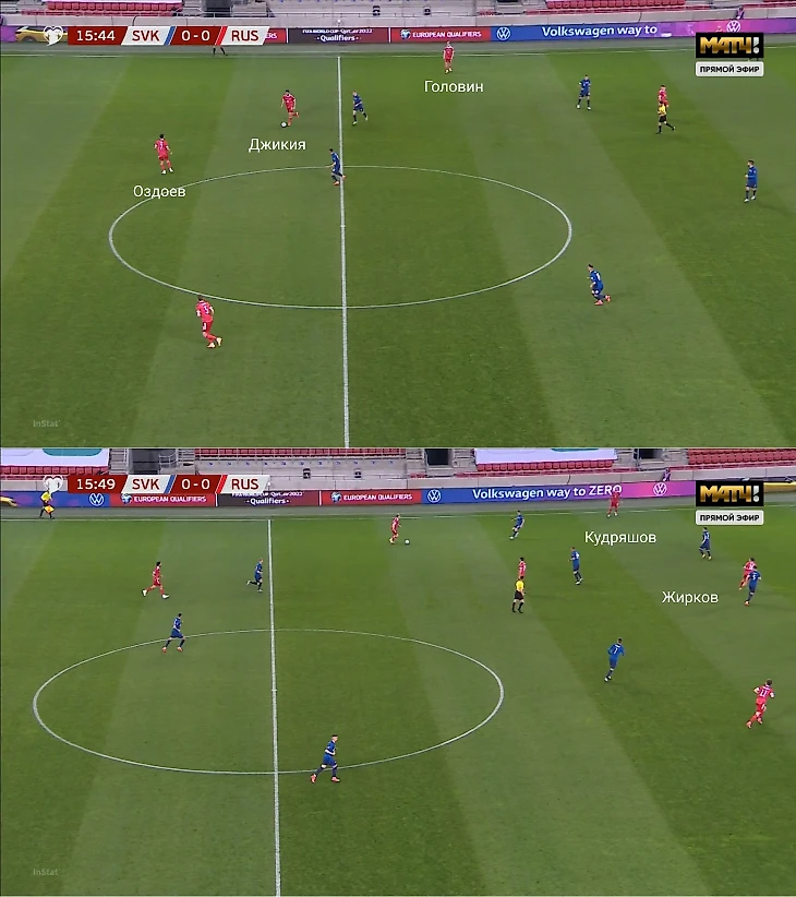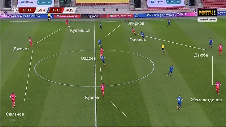 В первой фазе все ясно: Словакия не прессинговала, поэтому Кудряшов, Джикия и Семенов спокойно пасовались между собой. Чуть выше располагался Оздоев, который часто создавал ситуативные тройки с Семеновым и Джикией, позволяя Кудряшову дублировать Жиркова на фланге. Головин и Жемалетдинов были привязаны к флангам, Кузяев действовал между ними (временами располагался на одной линией с Оздоевым).