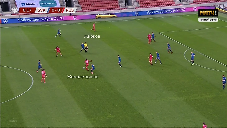 В первом эпизоде Жирков поддержал прессинг, хотя необходимости в этом не было. Жемалетдинов сфолил, а Словакия мгновенно разыграла мяч, забросив мяч за спину Юрию Валентиновичу. Итог – опасный прострел.