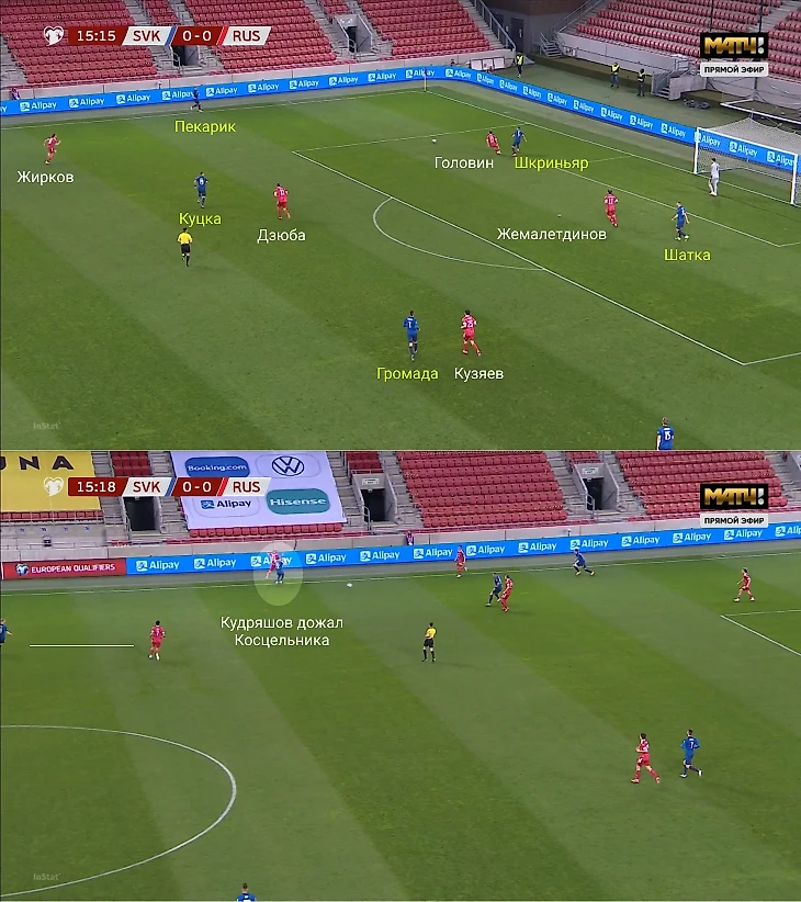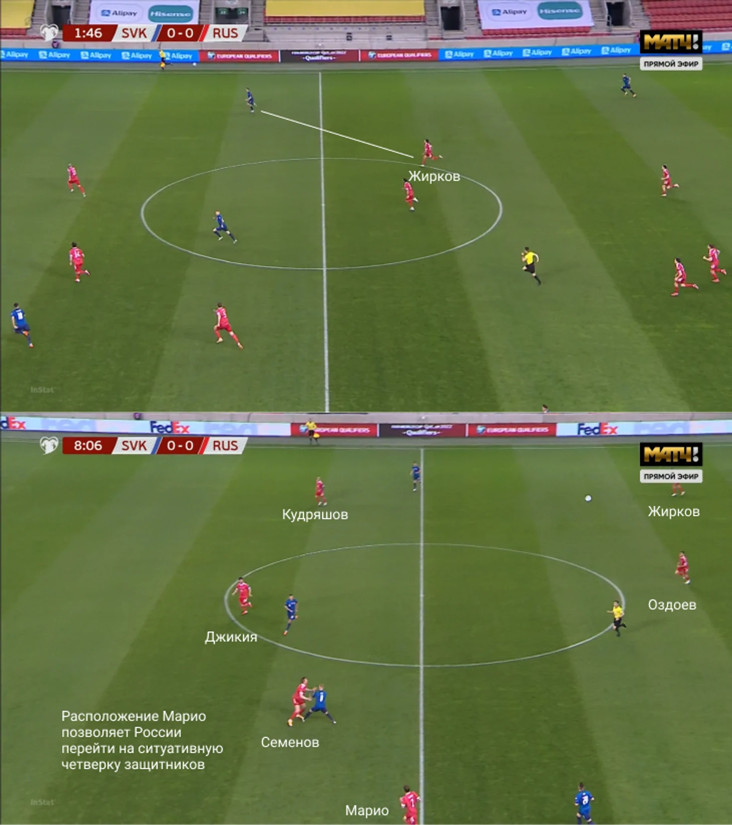 Второй эпизод: Марио располагается асимметрично относительно флангового давления Жиркова. Такое решение для латералей более верное: во-первых, так Россия численно превосходит атакующую группу Словакии; во-вторых, если провалится Оздоев, есть шанс вовремя перестроиться.