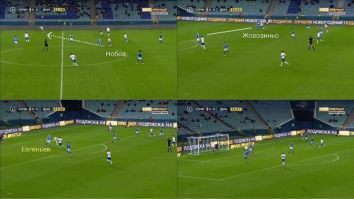Вот комбинированный пример отлаженного перехода и действий Заболотного при фланговой контратаке. «Сочи» перехватил мяч и мгновенно нашел Нобоа, Крис развернул атаку на фланг. Эффективно: передача отрезала полузащиту «Динамо», а смещение Жоаозиньо растянуло защиту, оставив Заболотного 1-в-1 с Евгеньевым. Затем Заболотный показал, что рванет на ближнюю штангу, но Жоаозиньо навесил Роману за спину.