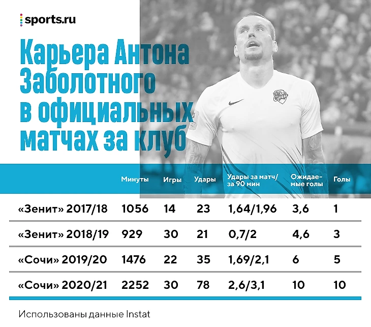 Важная оговорка: мы не лепим из Заболотного суперфорварда, но Антон – в топ-3 российских нападающих РПЛ по результативности. Дзюба забил 20 голов (3 – с пенальти), Соболев – 14 (5 – с пенальти), Заболотный – 9 (все с игры).
