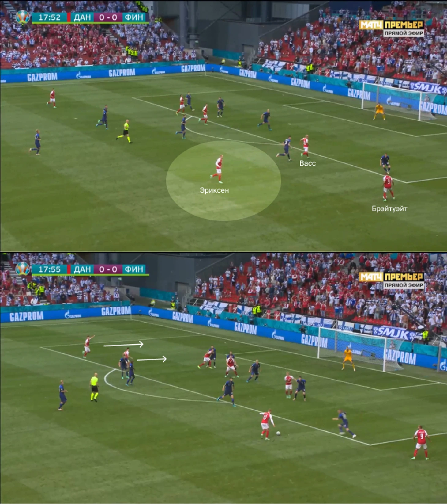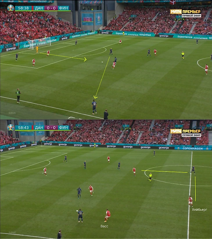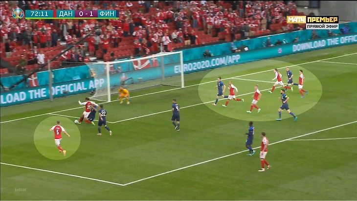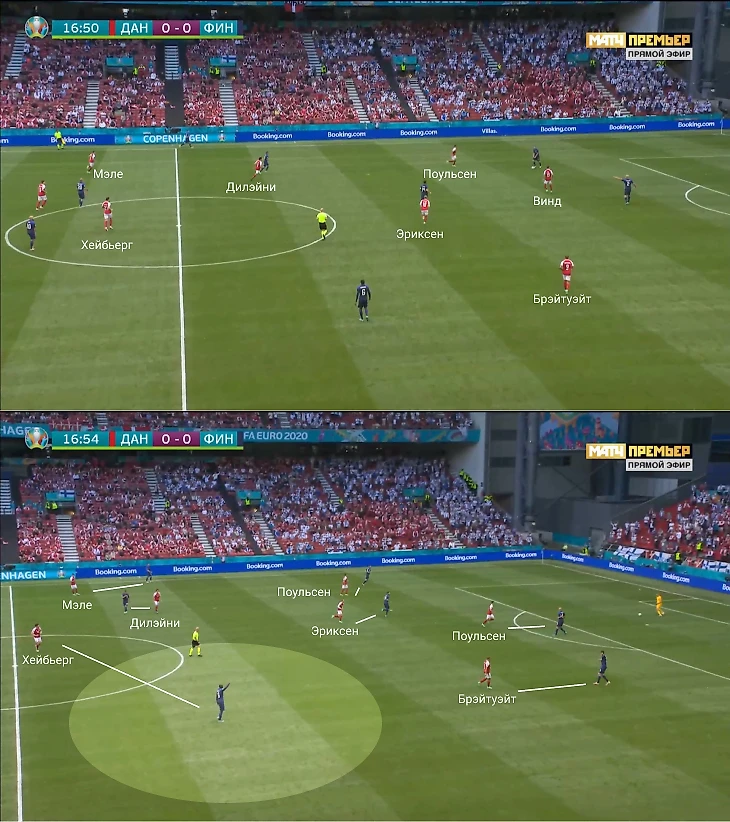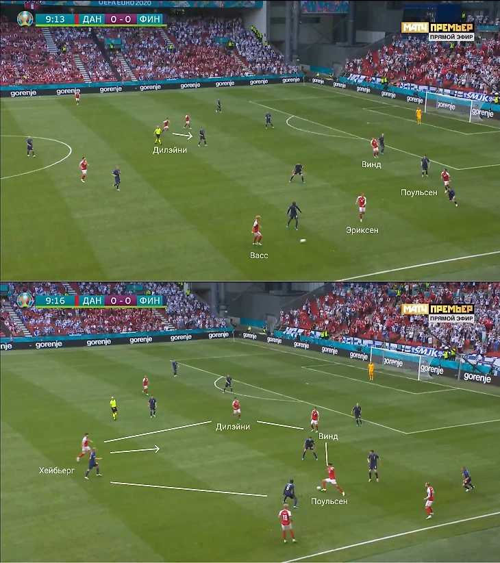 Датчане планировали персональный прессинг около ворот финнов: атакующая тройка разбирала центральных защитников, Эриксен подхватывал опорного полузащитника Спарва. Дальше роли становились плавающими, и датчане двигались от эпизода к эпизоду.