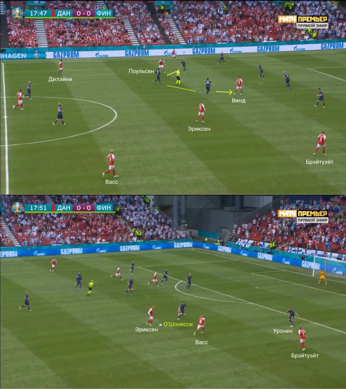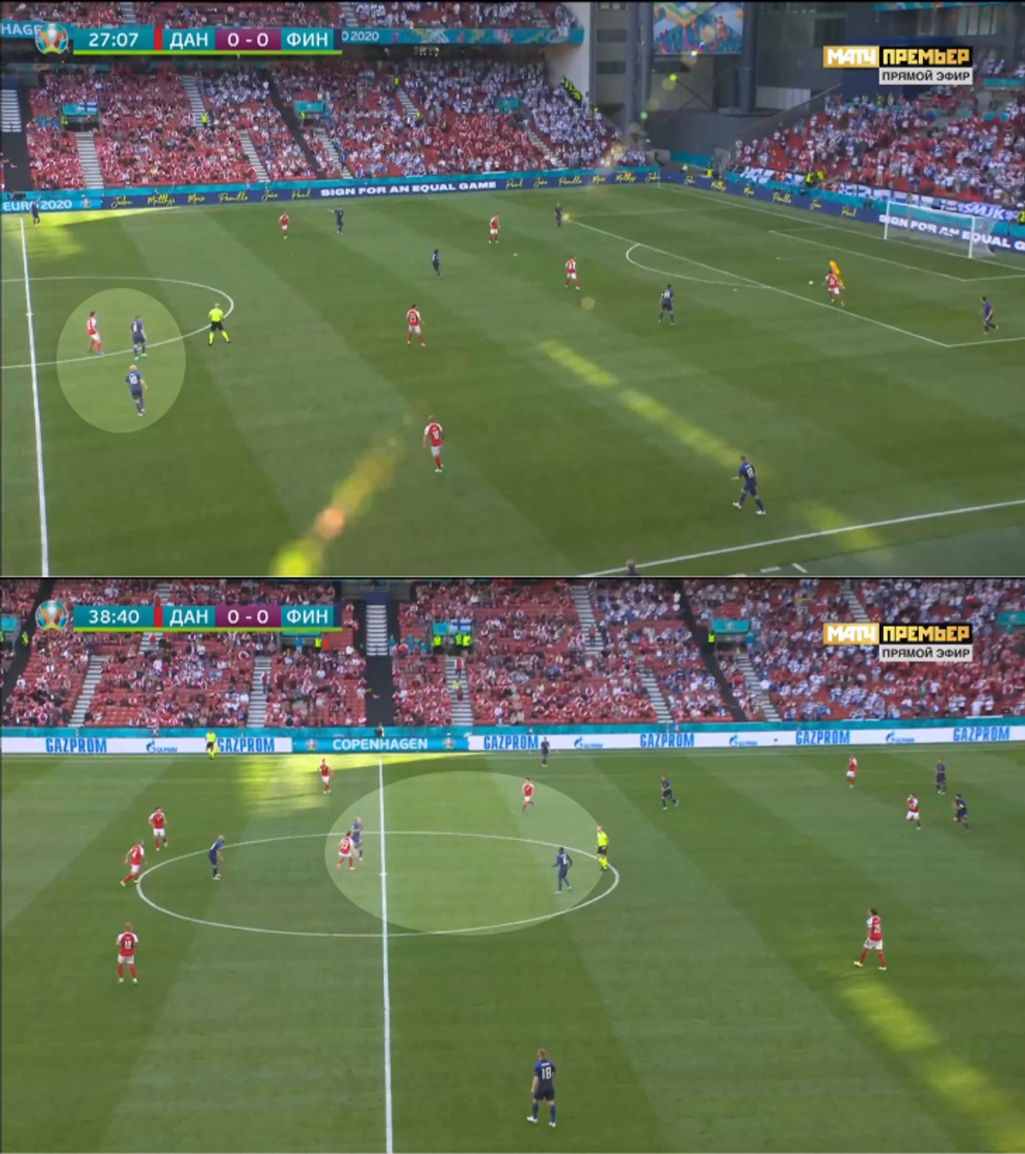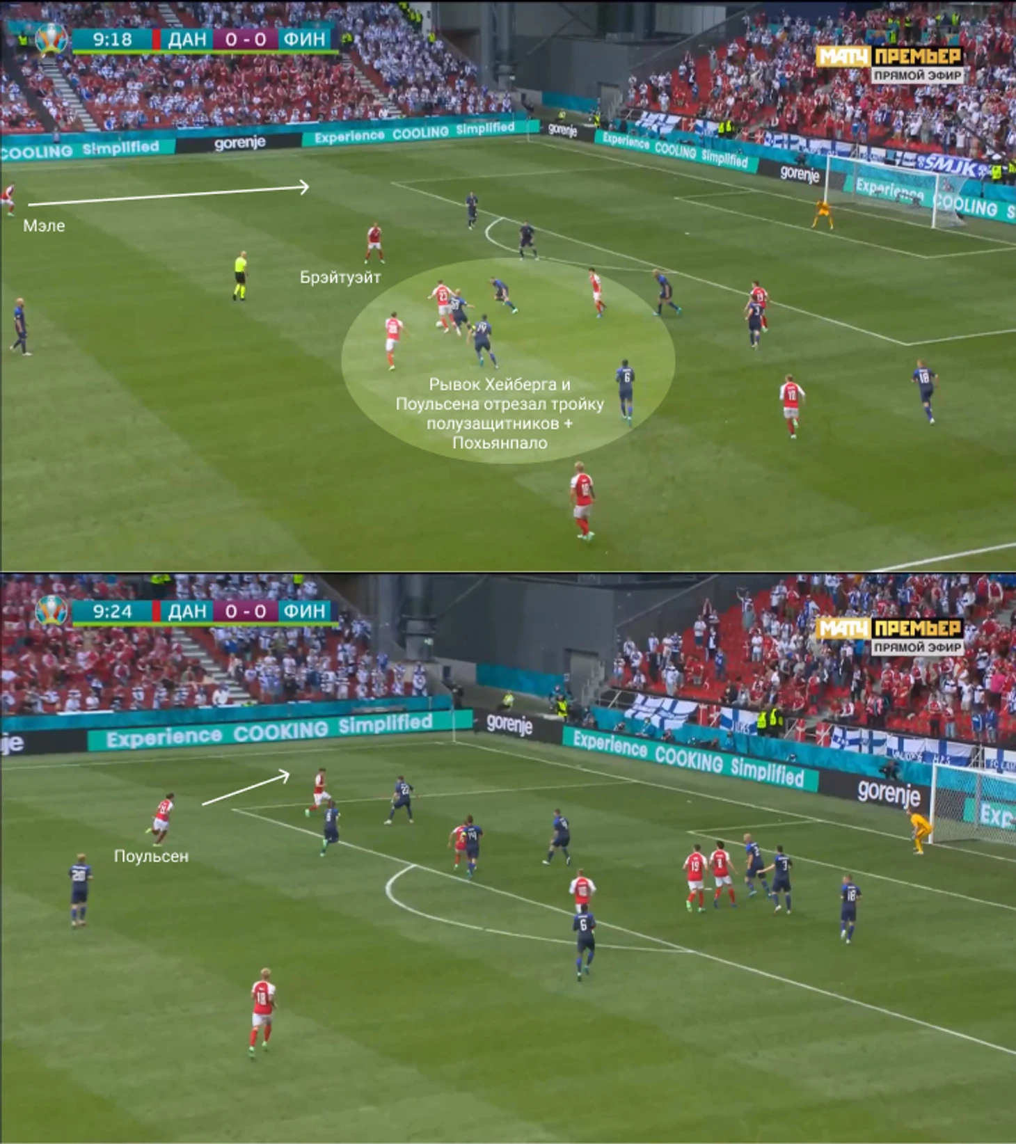 Датчане планировали персональный прессинг около ворот финнов: атакующая тройка разбирала центральных защитников, Эриксен подхватывал опорного полузащитника Спарва. Дальше роли становились плавающими, и датчане двигались от эпизода к эпизоду.