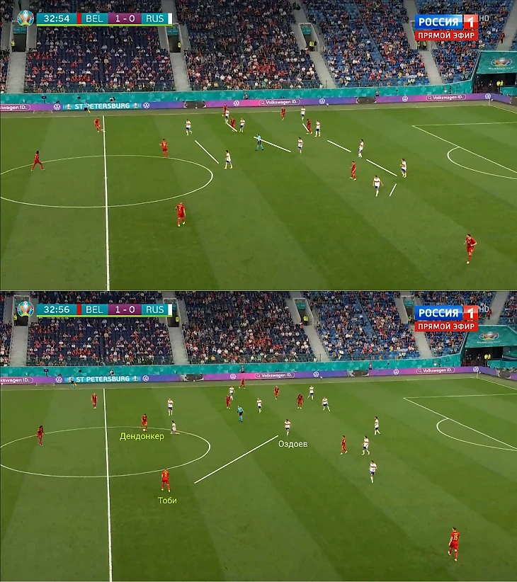 Такие эпизоды – серьезная стартовая площадка для Дании, ведь она умеет насыщать центр. Россия оборонялась линейными 4-4-2 (по факту – эпизод ниже ближе к финским 5-3-2). Дендонкер перевел на Тоби – у того впереди около 10 метров на свободное продвижение. Оздоев выдвинулся, но центр у России все равно оголен (теоретически он мог перевести в центр через Дендонкера). Тоби забросил мяч на фланг – оттуда и пришел второй гол.