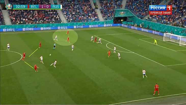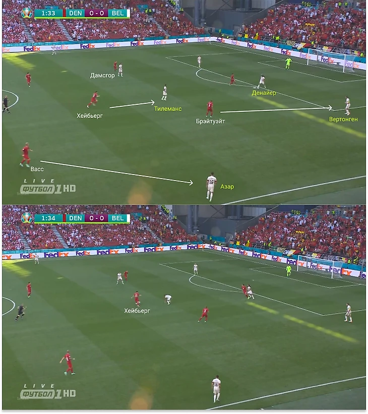 Принцип заметен при голевой атаке: Брэйтуэйт не выдавливал Вертонгена, а расположился между ним и Тилемансом. Это служило страховкой для Хейбьерга: если бы пошла передача на Тоби, к нему бы вышел Брэйтуэйт, а сам Пьер-Эмиль подхватил бы Тилеманса; а при забросе ему проще вернуться назад. Именно этот эпизод стал ловушкой для Бельгии: Денайер выкатил на Тилеманса, который не находился под персональной опекой на небольшом оперативном просторе. Но полузащитник «Тоттенхэма» быстро разобрался: выбросился из глубины и совершил перехват.