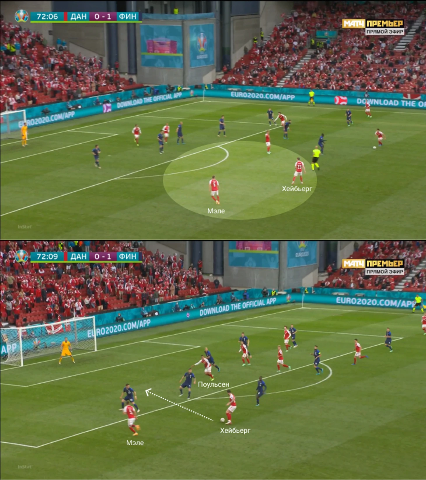 И дополнительно отметим классическую черту датчан: они снова массово зашли в штрафную, среди них есть игроки в выгодных позициях (Мэле свободен, а на входе во вратарскую ситуация 4-в-3).