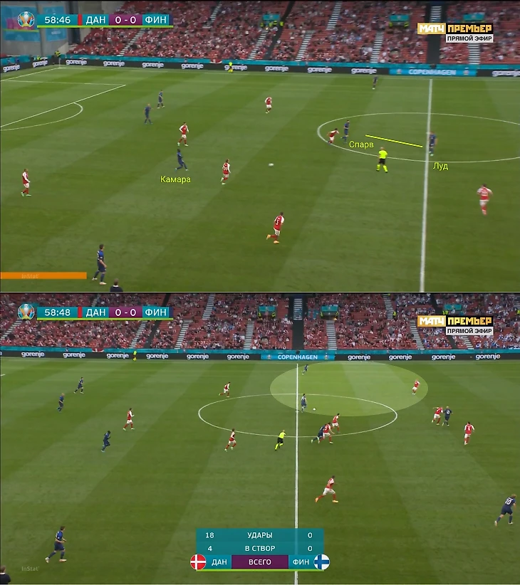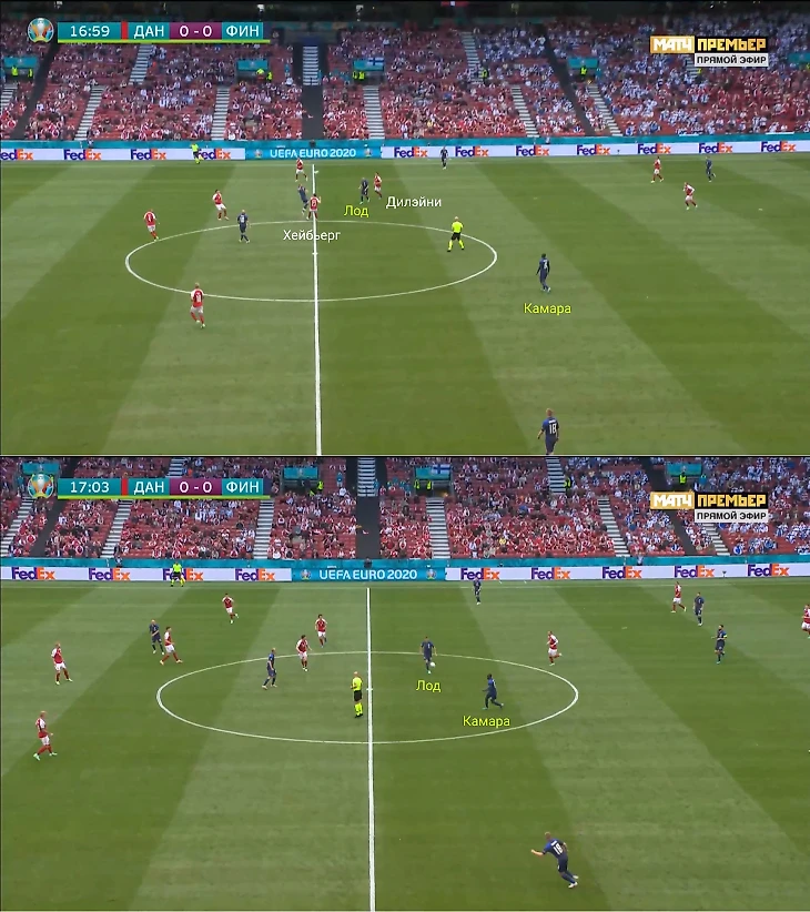 Финны проигнорировали свободного партнера и забросили в сторону форвардов. На лонгболл среагировал Дилэйни – Томас побежал на подстраховку к Хейбьергу. Так он упустил Луда, который подхватил мяч после отскока и покатил его на свободного Камара.