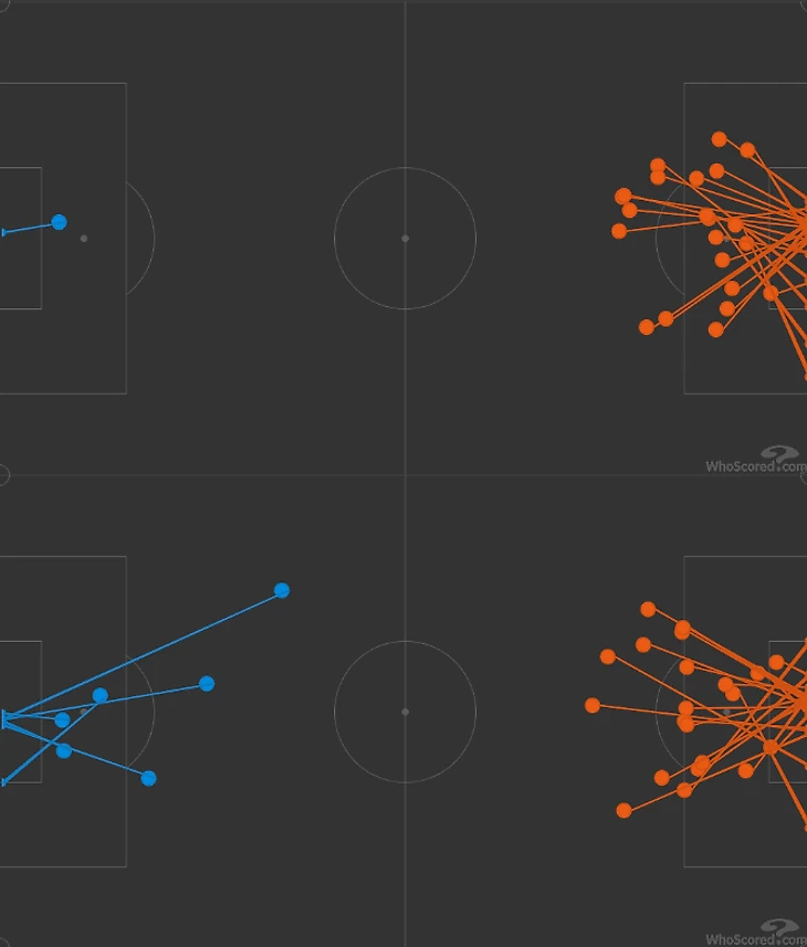 Тщательная доработка атак до ударов из штрафной – основная причина, почему Дания способна выстрелить на дистанции. Датские футболисты сыграли против двух разных тактических философий и каждый раз были рядом с победой. За два матча Дания пробила 43 раза, больше половины ударов – с близкого расстояния (сверху – карта ударов против Финляндии, ниже – с Бельгией).