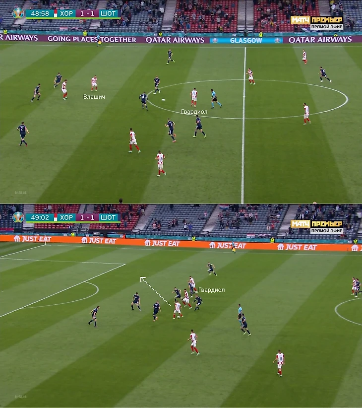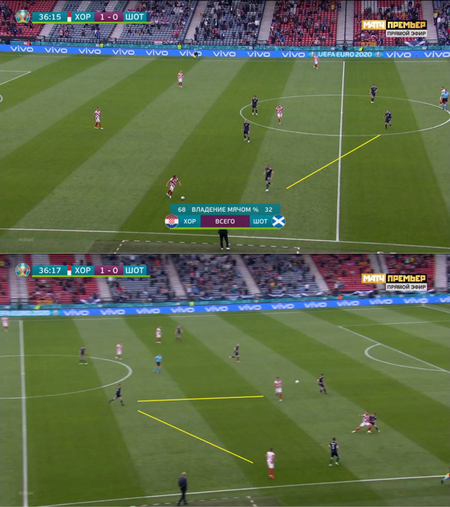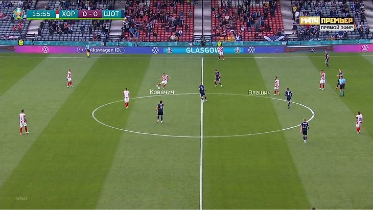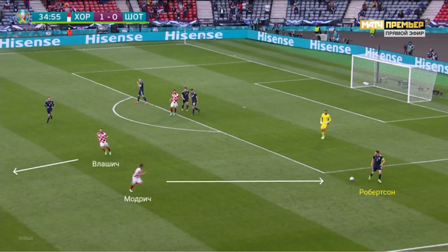 Важная часть успеха Хорватии – то, как Модрич страховал Влашича. Полузащитник ЦСКА часто оказывался в центре во время потерь хорватов, поэтому шотландцы периодически разворачивали атаки на его фланг (плюс там играл Робертсон).