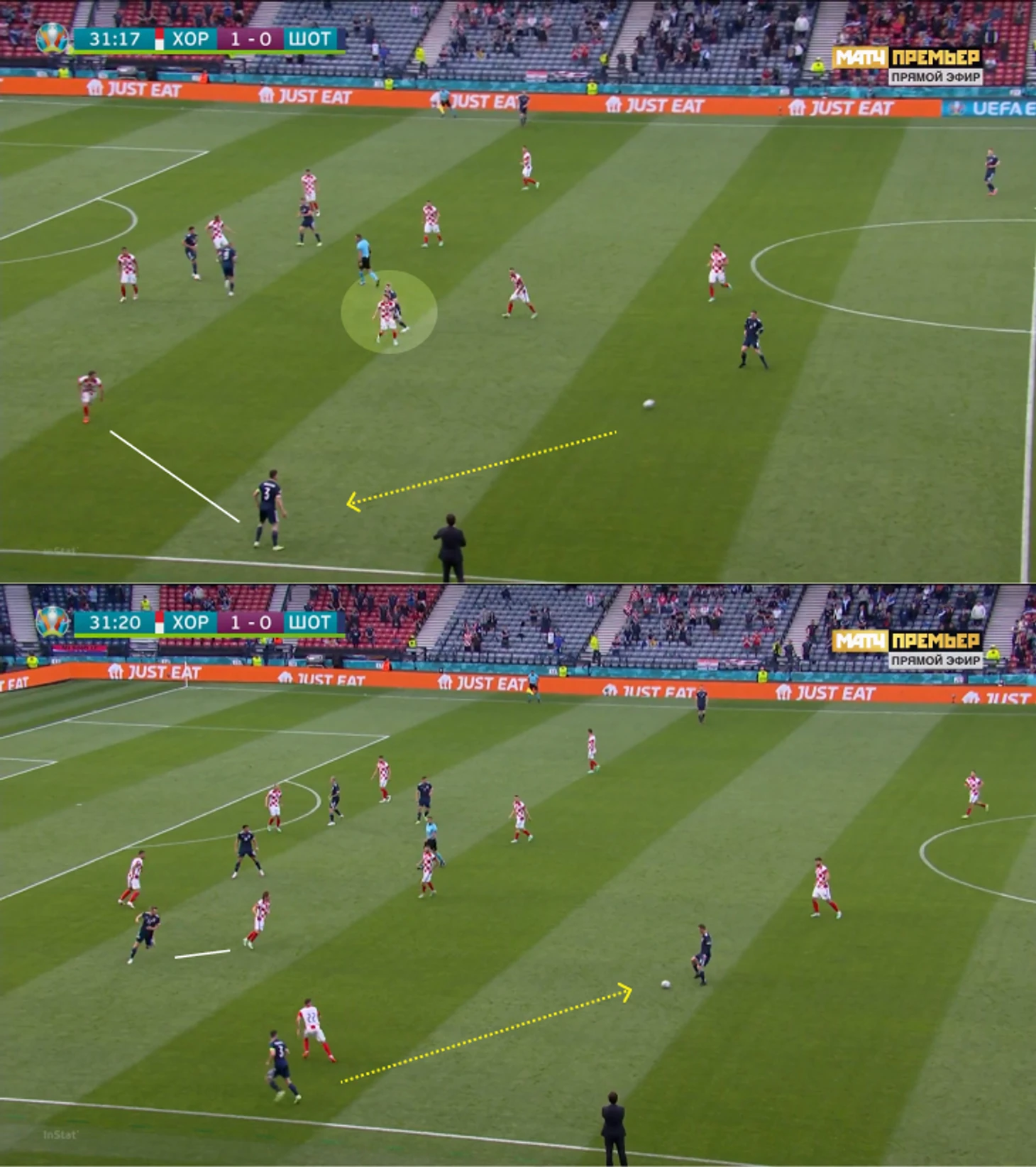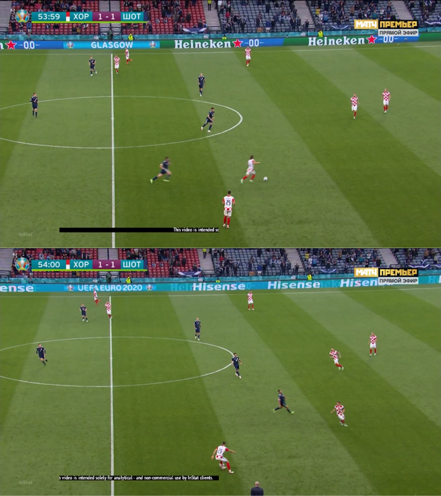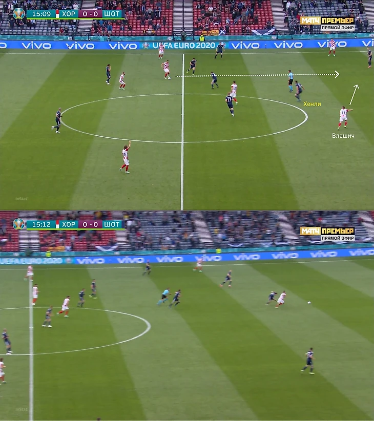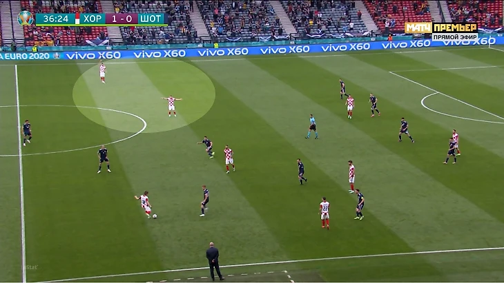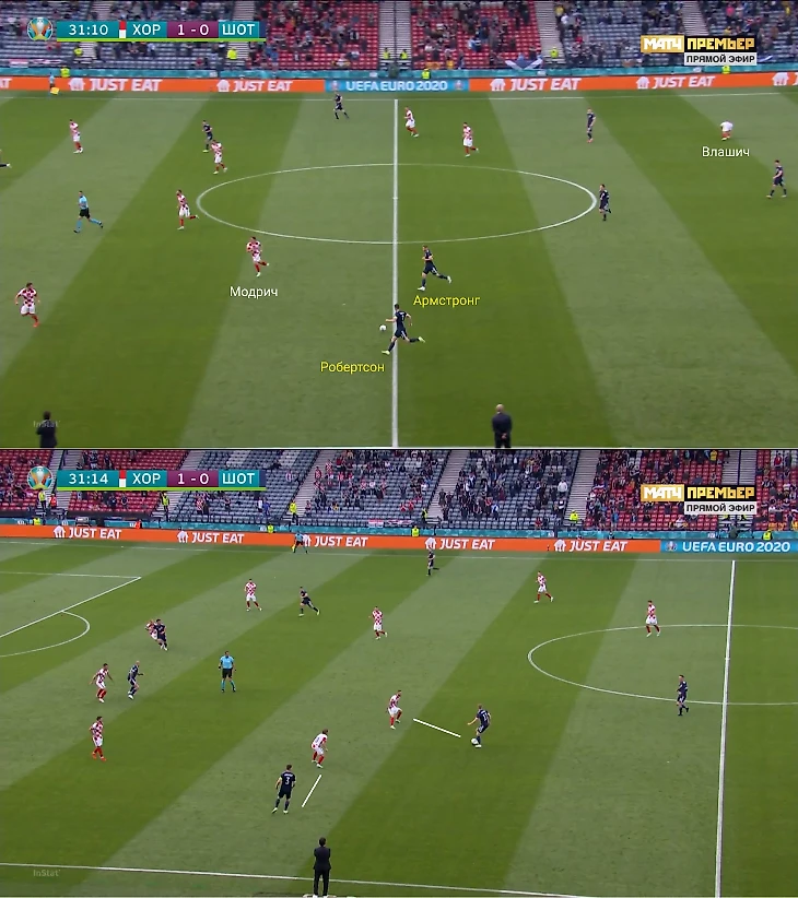 Там царствовал Модрич. Его выдвижения замедляли атаки Шотландии, позволяя хорватам вернуться. Первый пример: Влашич лежал на противоположном фланге, а Армстронг и Робертсон атаковали через его фланг. На помощь пришел Лука. Сначала он встретил Эндрю.