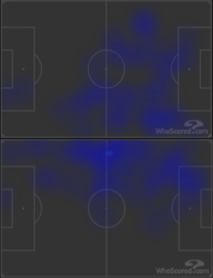 Никола стартовал правым полузащитником, но появлялся абсолютно везде: приходил на левый фланг к Перишичу, создавал пару форвардов с Петковичем, вылетал в контратаки. Верхний скрин – тепловая карта Николы, нижний – карта Ивана. Влашич получил больше свободы и успешно ей пользовался.