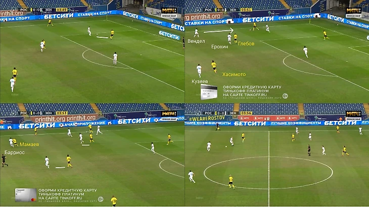 Пример. Дзюба и Азмун давили на центральных защитников, Вендел выдвинулся к Терентьеву. В таких ситуациях Ерохин играл по Глебову, Кузяев подхватывал Хасимото. Роль Барриоса и Сантоса определяла ситуация: эпизодически Вильмар забирал Мамаева, но если Павел уходил на фланг, с ним мог сыграть Дуглас. В этом эпизоде все прошло по первому сценарию. У Терентьева был вариант с Байрамяном, но Денис выбрал заброс, за который не зацепился Комличенко.