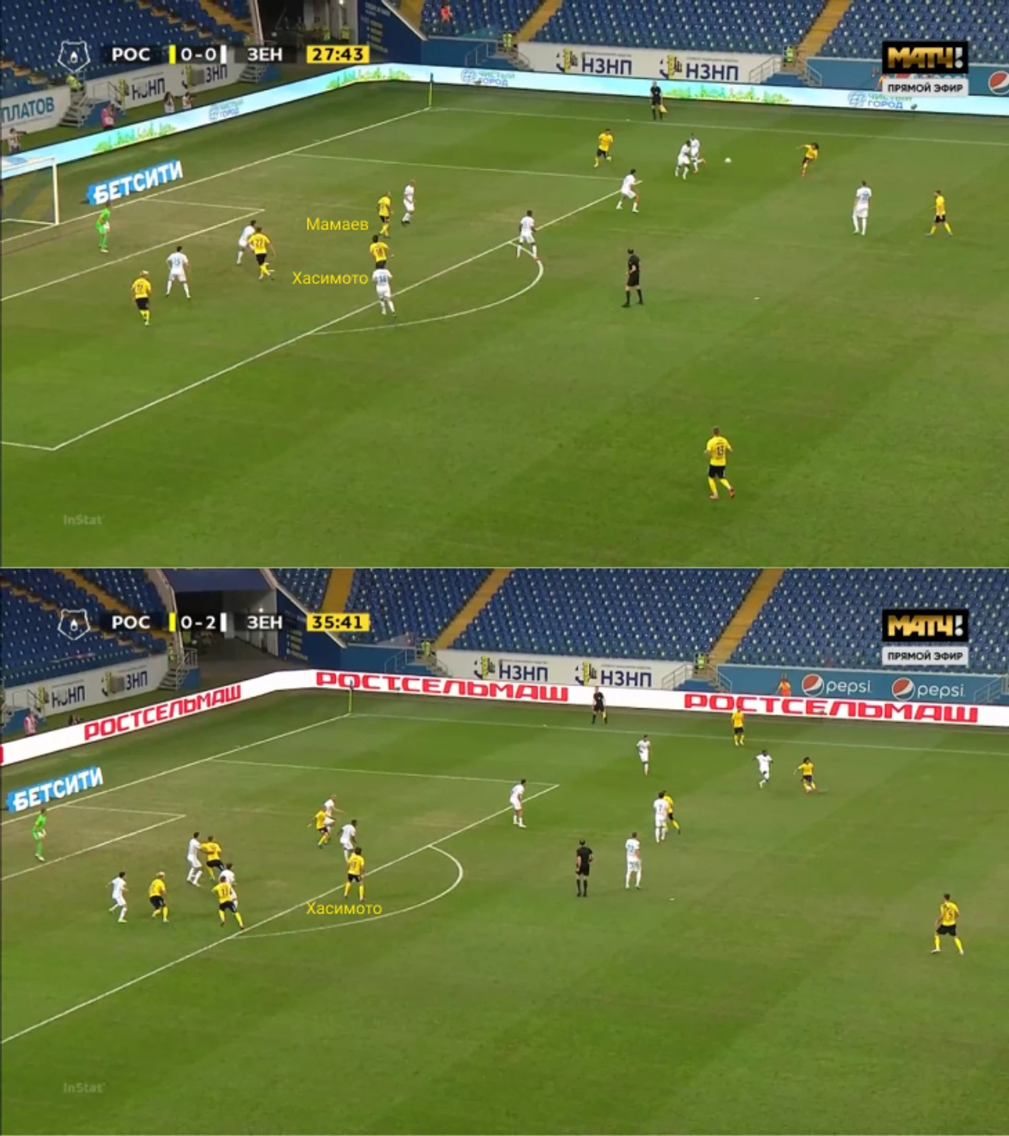 У ростовчан было две проблемы. Первая – сумбур в опорной зоне. «Зенит» очень легко находил игроков за спинами опорных полузащитников. Плюс «Ростов» с этим мучался при атаках вторым темпом или контрвыпадах: неоднократно игроки «Зенита» опережали Хасимото и Мамаева, находя новые варианты под позиционки.